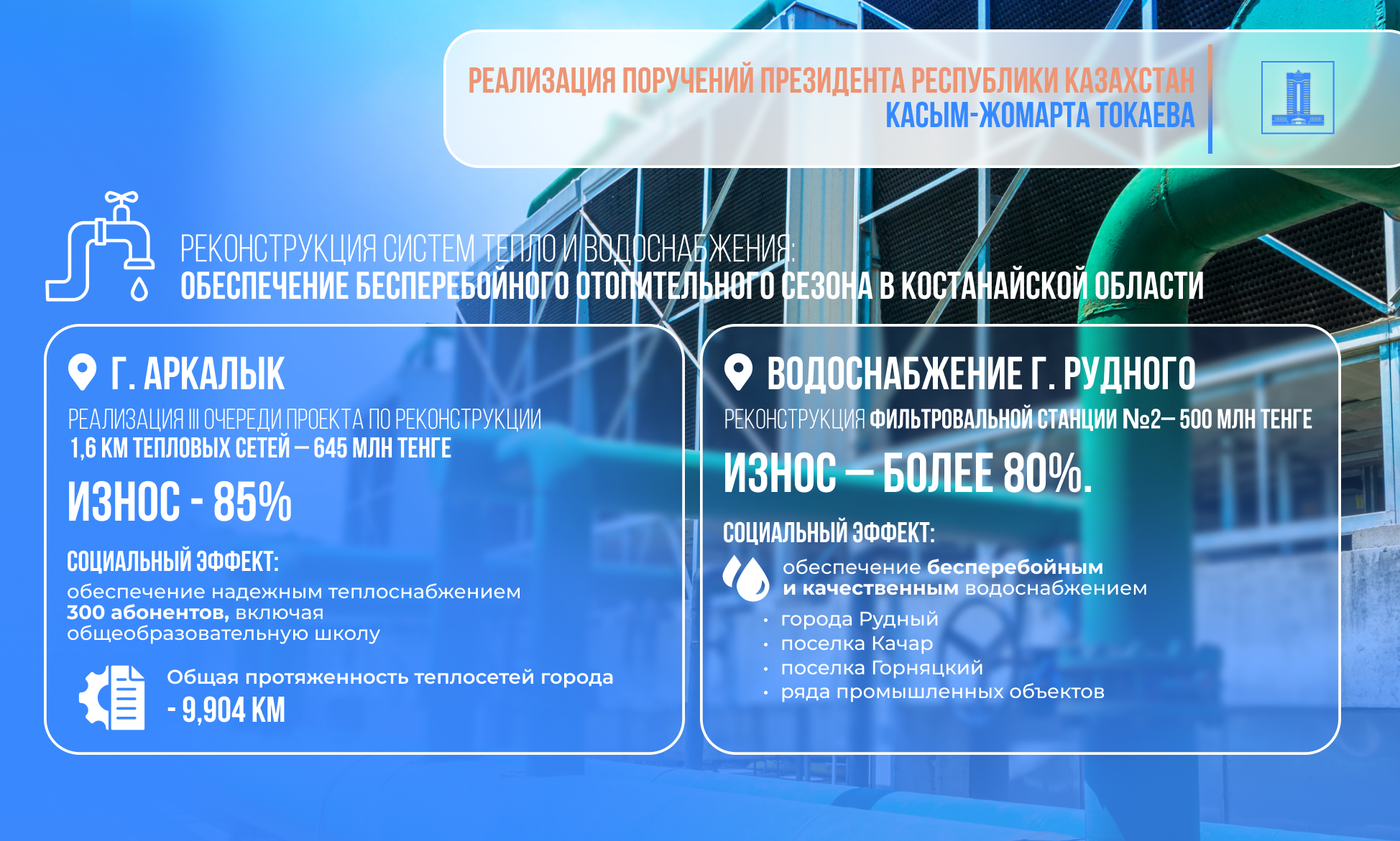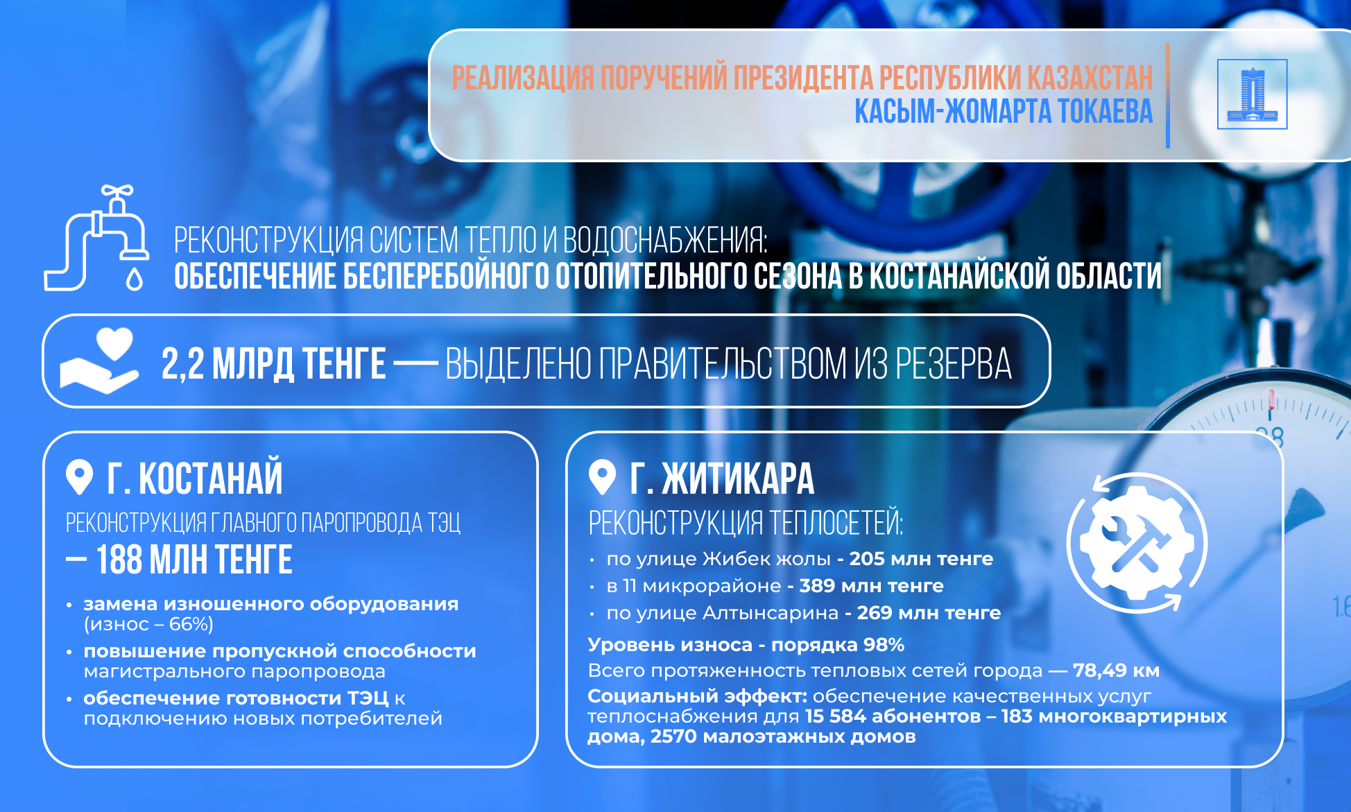 Средства направлены на ремонт объектов теплоснабжения городов Костаная, Житикары, Аркалыка и водоснабжения Рудного.